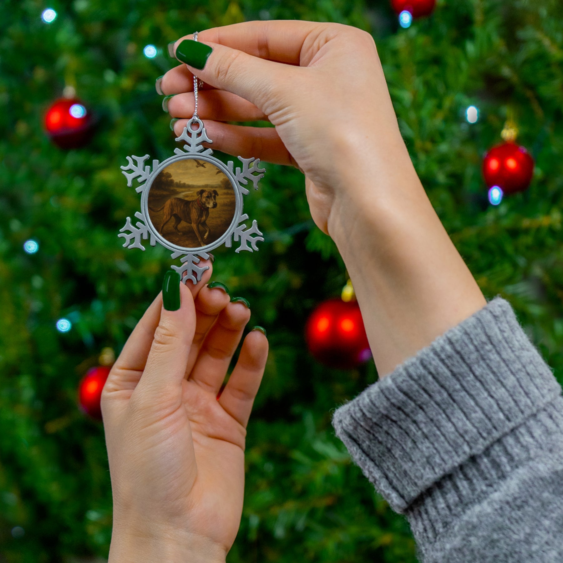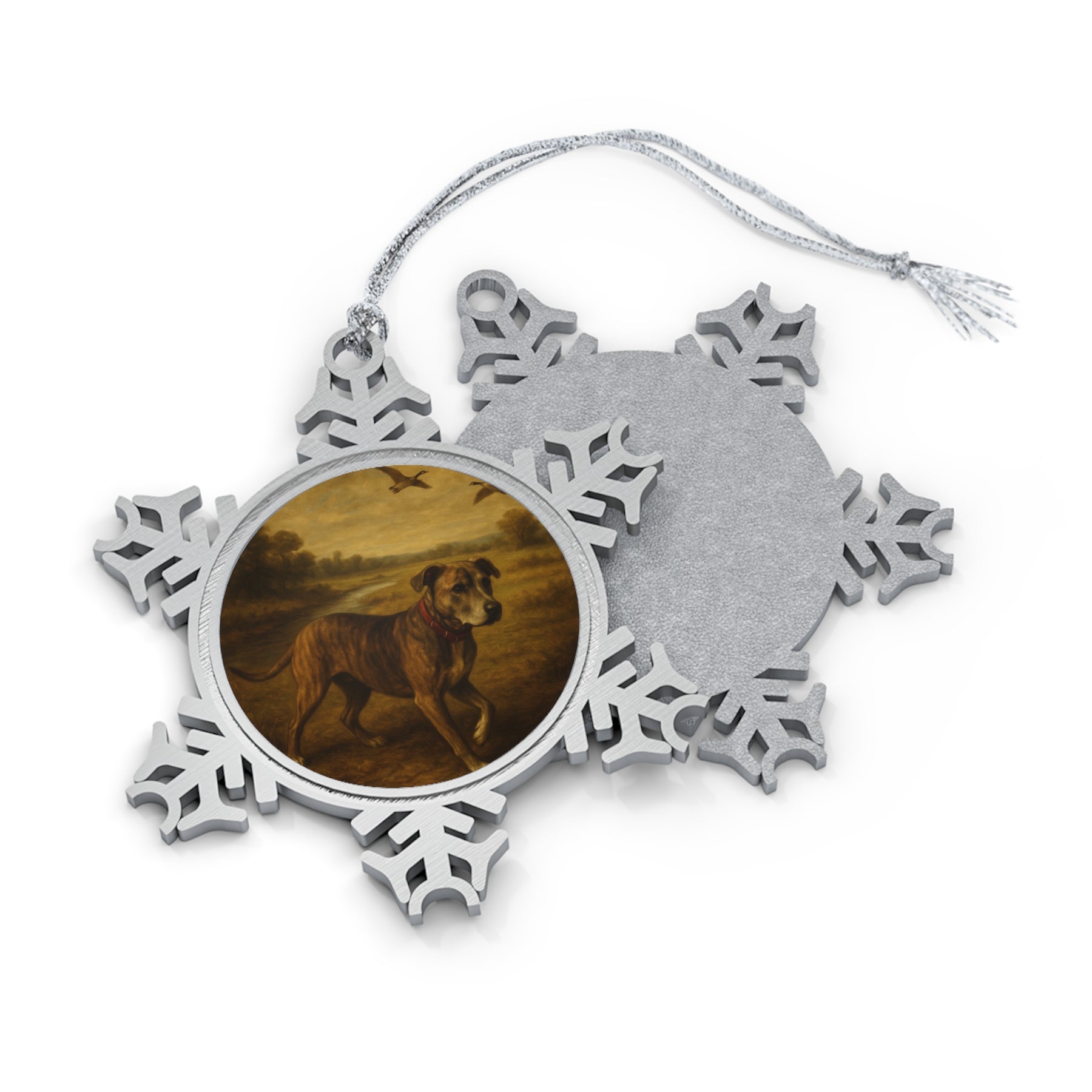 Personalized pewter snowflake ornament featuring a picture of your furry friend. Adds a special touch to your Christmas tree or holiday decorations. Perfect for pet lovers looking to cherish their furry companions during the holiday season.