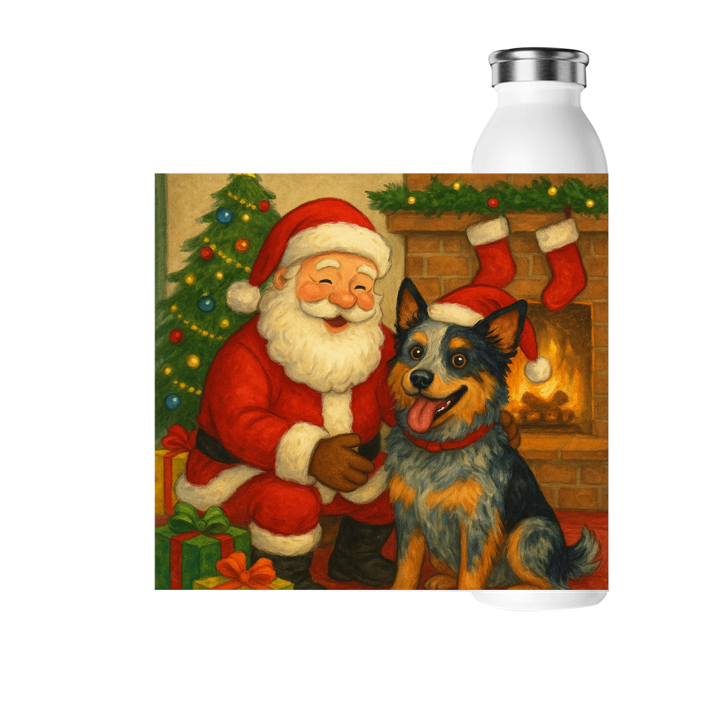 Bring festive cheer wherever you go with our exclusive “Santa and Max” 20oz stainless steel water bottle! This fun and heartwarming design features jolly Santa Claus and Max, the adorable Australian Shepherd Mix, sharing a special moment by the Christmas tree and fireplace. It’s the perfect holiday accessory for dog lovers, Aussie Shepherd fans, and anyone who wants to stay hydrated in style.
